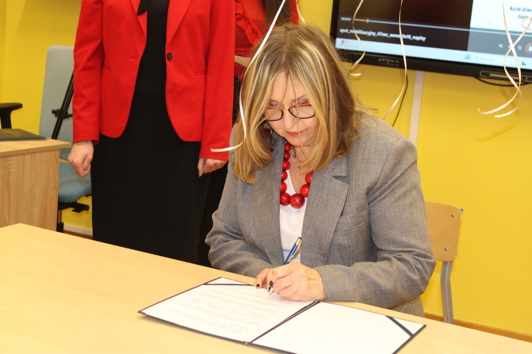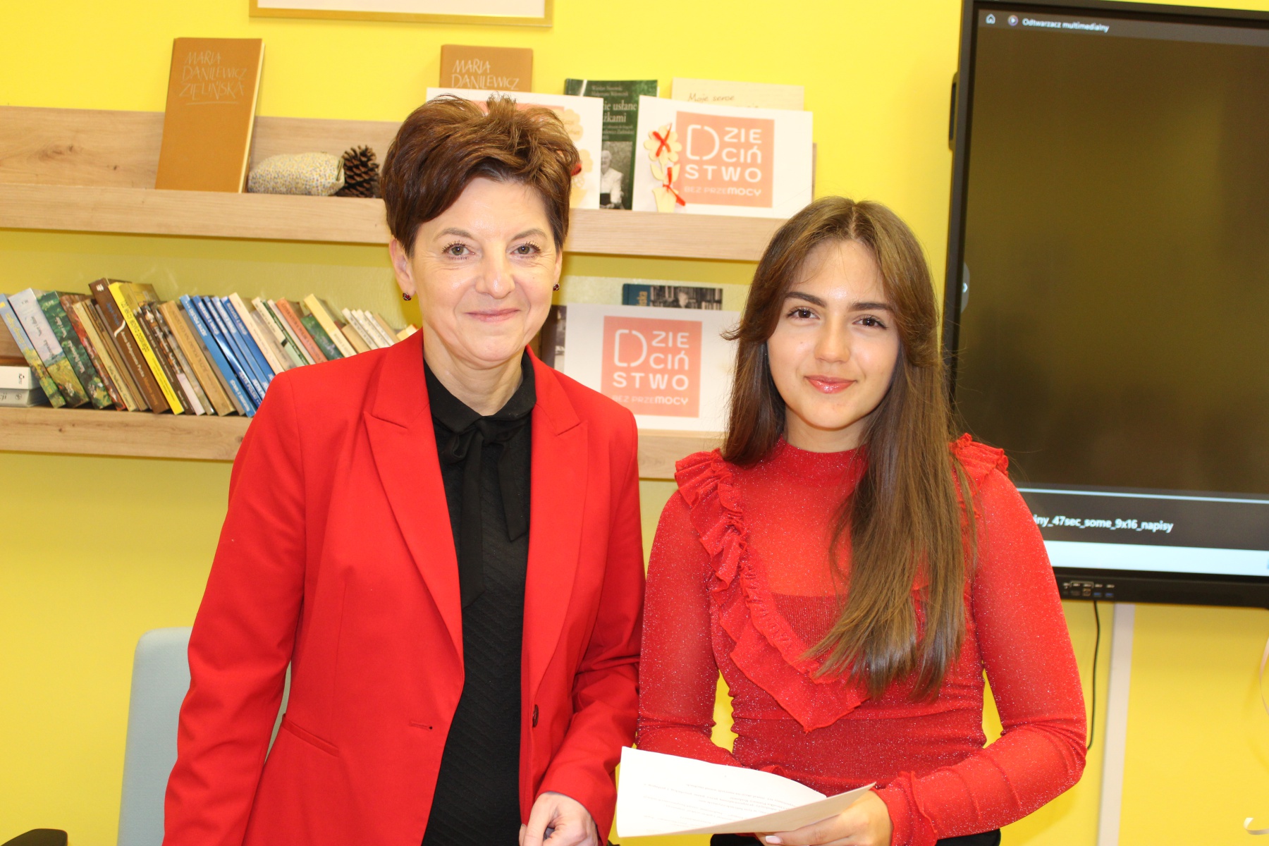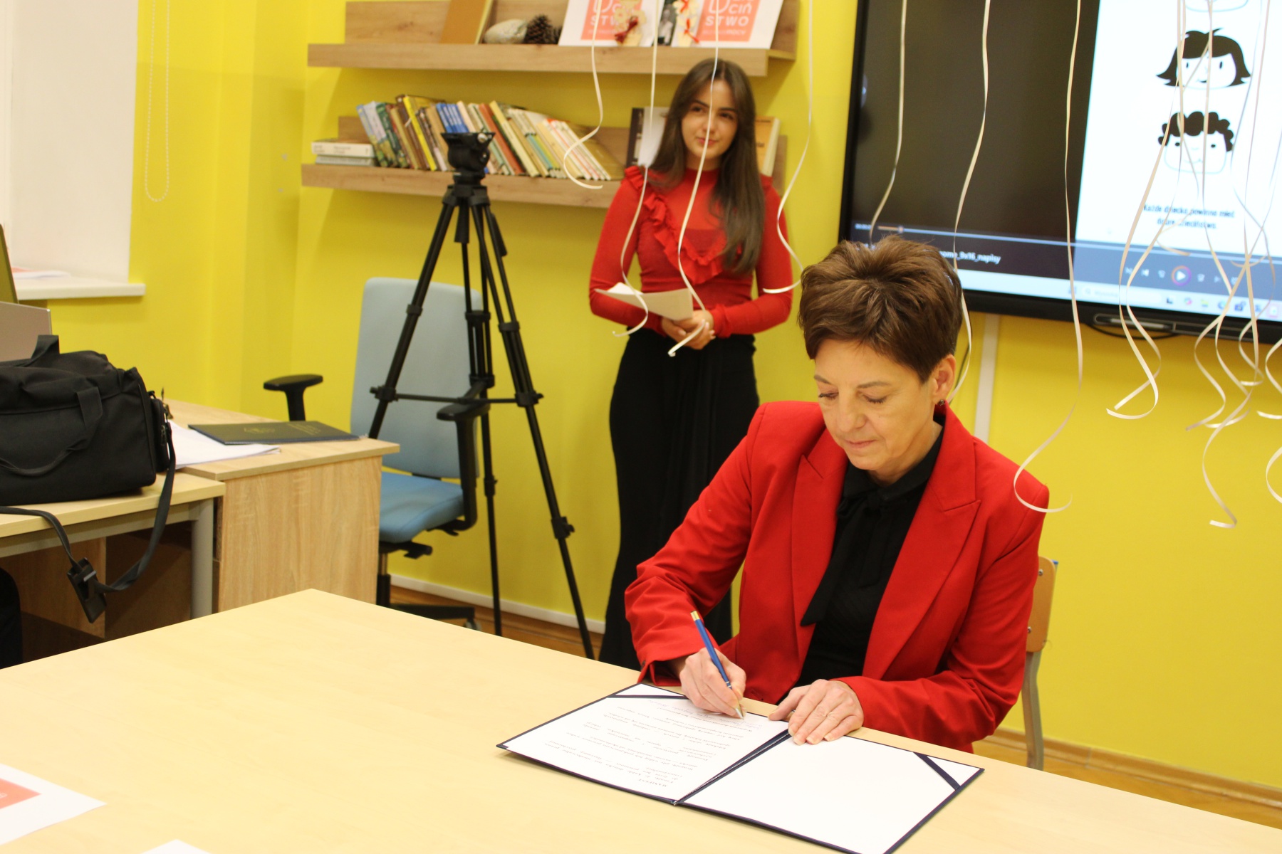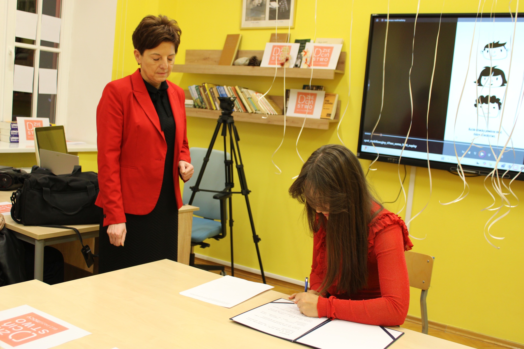 LMK włączyło się także w ogólnopolski finał akcji. W środę 19 października gmach naszej Szkoły został podświetlony na czerwono. W obecności specjalnego gościa – zastępczyni Prezydenta Miasta Włocławek – p. Moniki Jabłońskiej – p. Dyrektor Aneta Jaworska oraz reprezentantka młodzieży LMK – Anhelina Husieva uroczyście podpisały się pod tekstem manifestu gwarantującego każdemu dziecku prawo do życia bez przemocy. Następnie zgromadzeni uczniowie LMK wypuścili w niebo białe balony jako symboliczny gest solidarności z ideą przewodnią akcji. Dzieciństwo bez przemocy daje dzieciom siłę do realizacji własnych marzeń i pragnień oraz szczęśliwego życia.