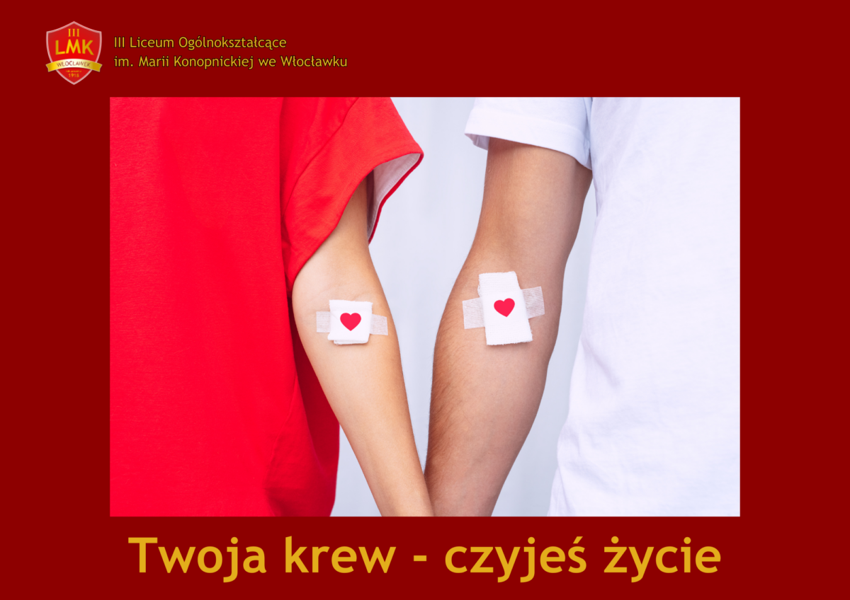 III Liceum Ogólnokształcące im. Marii Konopnickiej we Włocławku przy współpracy z Regionalnym Centrum Krwiodawstwa i Krwiolecznictwa w Bydgoszczy – odział we Włocławku zaprasza do honorowego dawstwa krwi i szpiku kostnego.